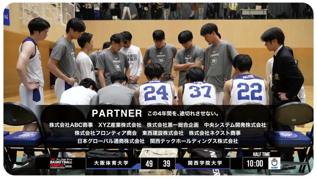 関西学生バスケットボール連盟主管大会のライブ配信内に、御社名(サービス名)をテキスト表記にて掲載いたします。