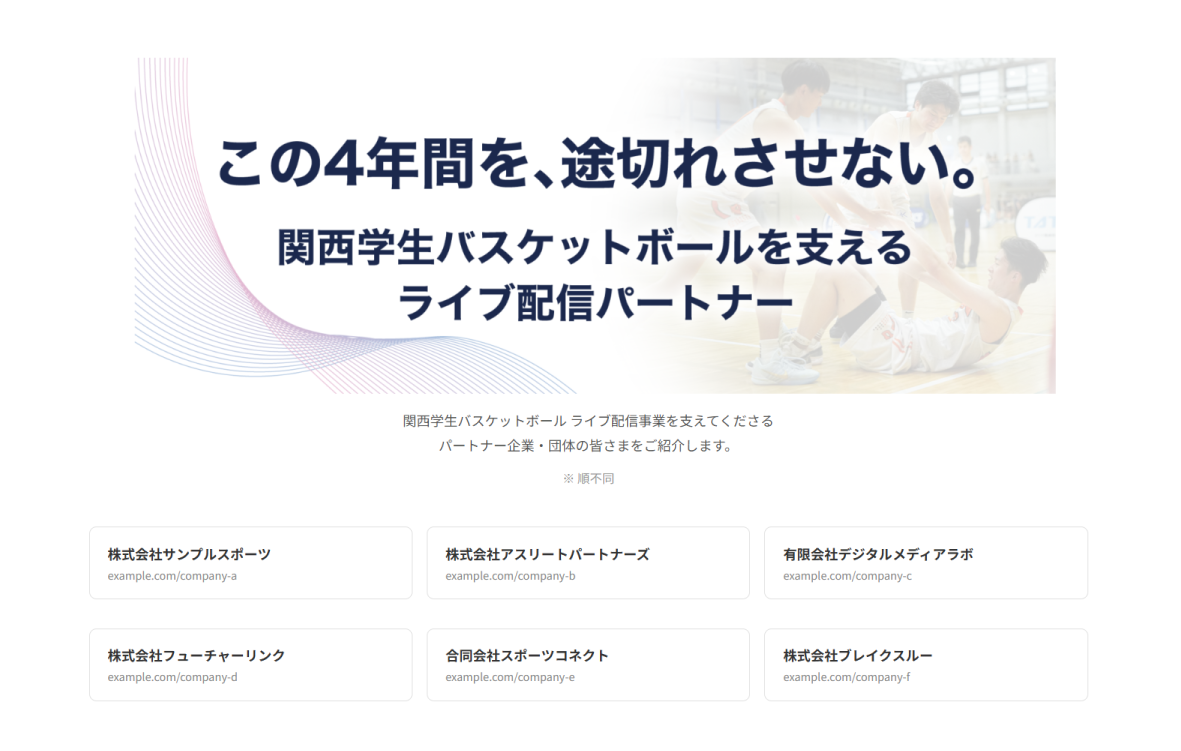 本パートナーシップは、関西学生バスケットボールのライブ配信事業全体を支えていただくものです。